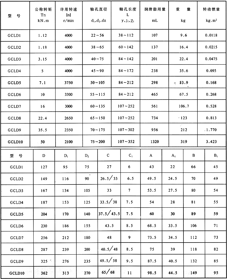 本聯軸器適用于聯接電機與機械兩水平軸線傳動軸系,具有一定角向補償兩軸相對偏移性能的鼓形齒式聯軸器,工作環境溫度-20~+80℃,傳遞公稱轉矩為1.12~50KN·m。 GCLD型 聯軸器參數與尺寸(mm)
