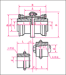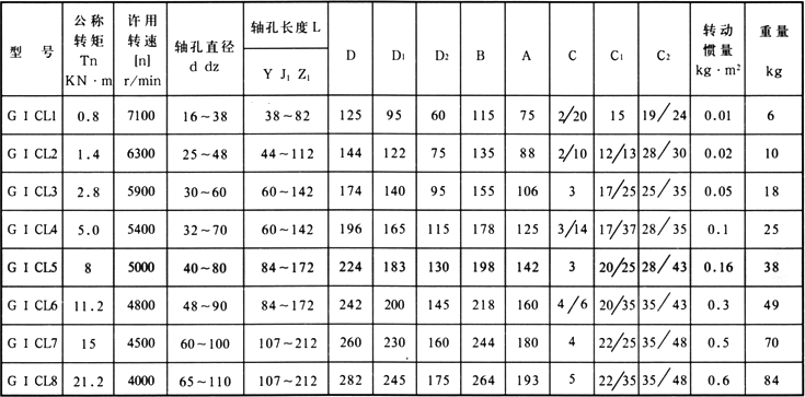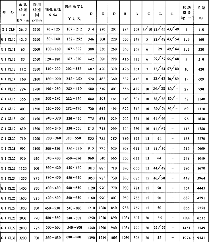 本聯軸器適用于聯接水平兩同軸線,并具有一定角向位移的傳動軸系。傳遞公稱轉矩為0.8~3200KN·m,工作環境溫度-20~+80℃。 GICL型 聯軸器參數與尺寸(mm) 注 1 聯軸器重量及轉動慣量是按最小軸孔最大長度的近似值。 2 dZ孔允許最大220mm。 3 當齒面要求氮化及表淬時應與制造廠洽談,并可增加轉矩30%。